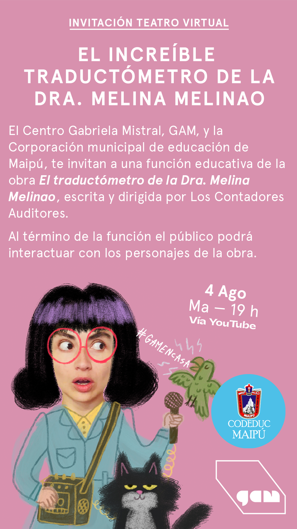 Invitamos a toda nuestra comunidad educativa para participar del estreno de la función teatral educativa “El increíble traductómetro de la Dra. Melina Melinao” de la compañía de teatro los contadores auditores. Esta función se realizará mañana martes 4 de Agosto a las 19hrs via YOUTUBE LIVE. Para participar, debes completar el formulario de inscripción que […]